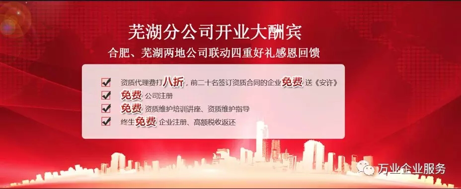 說到這里怎么能少得了優惠活動呢    福利時間到!       為了感謝大家長期以來一直對本司的支持        特推出開業大酬賓活動   合肥、蕪湖兩地公司聯動四重好禮感恩回饋!!     免費福利   1 資質代理費打八折,前二十名簽訂資質合同的企業免費送《安許》   2 免費公司注冊   3 免費資質維護培訓講座、資質維護指導   4 終生免費企業注冊、高額稅收返還          說了這么多,快跟隨小編一睹新公司的風采吧!                     開分公司對于我們來說是挑戰也是機遇,挑戰在于外部環境,機遇在于面對挑戰我們仍然能夠快速處理并且不斷自我優化。現分公司需要做的就是充分發揮我們的優勢,希望在這座城市里能夠做出更好的成績來回饋大家。謝謝大家長期以來的支持,安徽萬業才能更好的成長為大家提供更優質的服務!我們相信,蕪湖分公司這艘滿載著希望的巨輪,定能乘風破浪到達成功的彼岸!